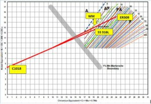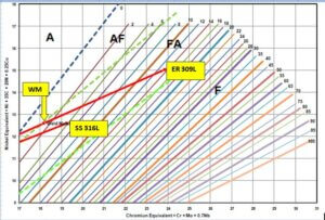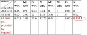 Later, I will try to explain the effect of “uninvited” Nitrogen content (in your ER 309L Filler Metal composition) on the dissimilar CS to 316L joint Weld Metal Ferrite content, i.e., Ferrite Number (FN), final mode of solidification, and thus solidification tendency as a function of the above two parameters by demonstrating the Analysis on WRC-1992 diagram.